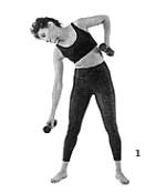 6. Wearing wrist weights or using dumbbells, do side bends as in exercise #2. Ten left side bends plus 10 right side bends equal one set. Do one set two times a day.