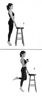 1. Raising the calves. Fut a thick book or a block of wood on the floor, approximately a foot behind the base of a sturdy chair. Stand on the book, and grasp the chair back firmly. Keep your heels on the floor, but put your toes on the book.